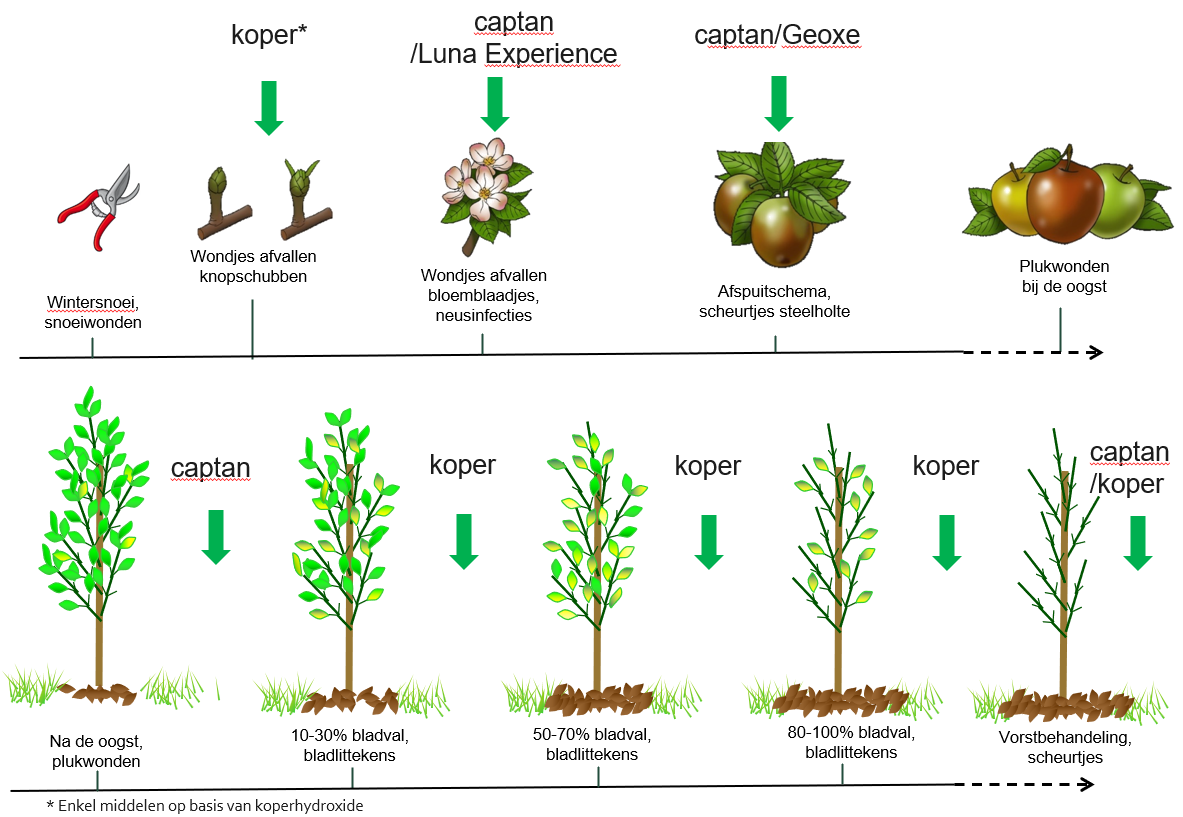 Figuur 1 toont de verschillende momenten waarop je behandelingen kan uitvoeren. In laag risico percelen kan een behandeling met koper op 10% en 50% bladval al volstaan. In hoog risico percelen (gevoelige variëteiten) kan een extra behandeling met captan net na de pluk en een bijkomende koperbehandeling bij 100% bladval en na vorst, noodzakelijk zijn. Daarnaast kan je in het seizoen ook Luna Experience of Geoxe/Safir inzetten. Dat kan bv. op momenten waar vruchtinfecties mogelijk zijn.