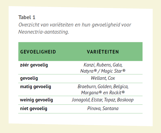 Teelttechnische maatregelen tegen vruchtboomkanker worden steeds belangrijker door het wegvallen van behandelingsmogelijkheden. Rasgevoeligheid is een belangrijk item bij de keuze voor een nieuwe appelvariëteit (Tabel 1). Hoe minder gevoelig een variëteit is voor vruchtboomkanker, hoe kleiner de kans op infecties met deze pathogeen.