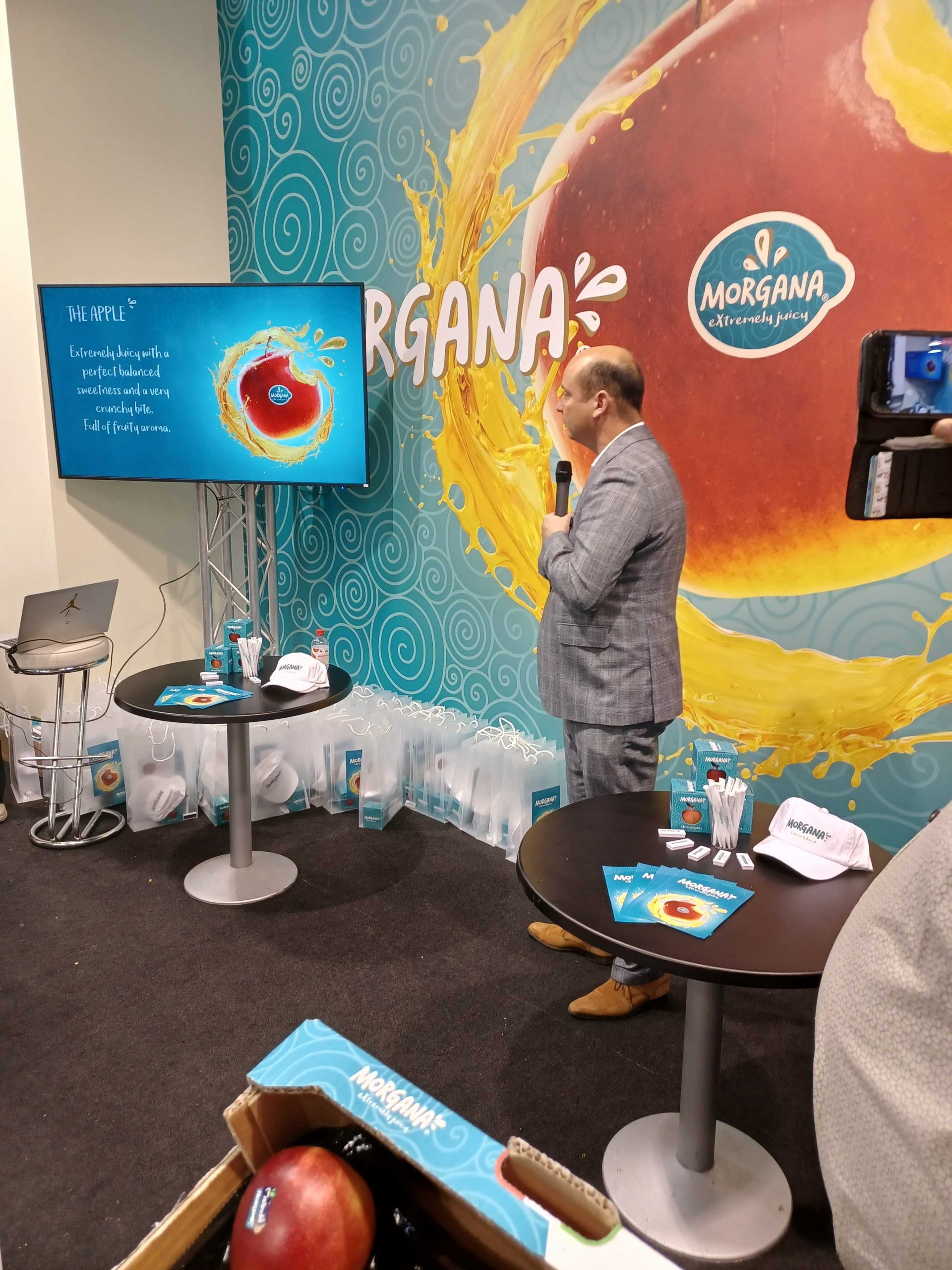 Op de stand van ABCz werd door Willem Broux, Carolustrees en ABCz, het project rond Morgana® voorgesteld (Foto 10). In Europa zijn er vier partners, namelijk BFV (België), Fruitmasters (Nederland), Krings (Duitsland) en Melinda (Italië). In 2022 bedroeg de totale productie van Morgana® 7.000 ton. Het doel is om in 2030 een productie te halen van 33.000 ton. Tegen 2036 zou dat 48.000 ton moeten zijn. Overzeese partners zijn A.N.A., Ceres Fruit Growers (Zuid-Afrika) en Nieuw-Zeeland. Als afsluiter namen alle Europese partners kort even het woord om hun vertrouwen in Morgana® uit te spreken.