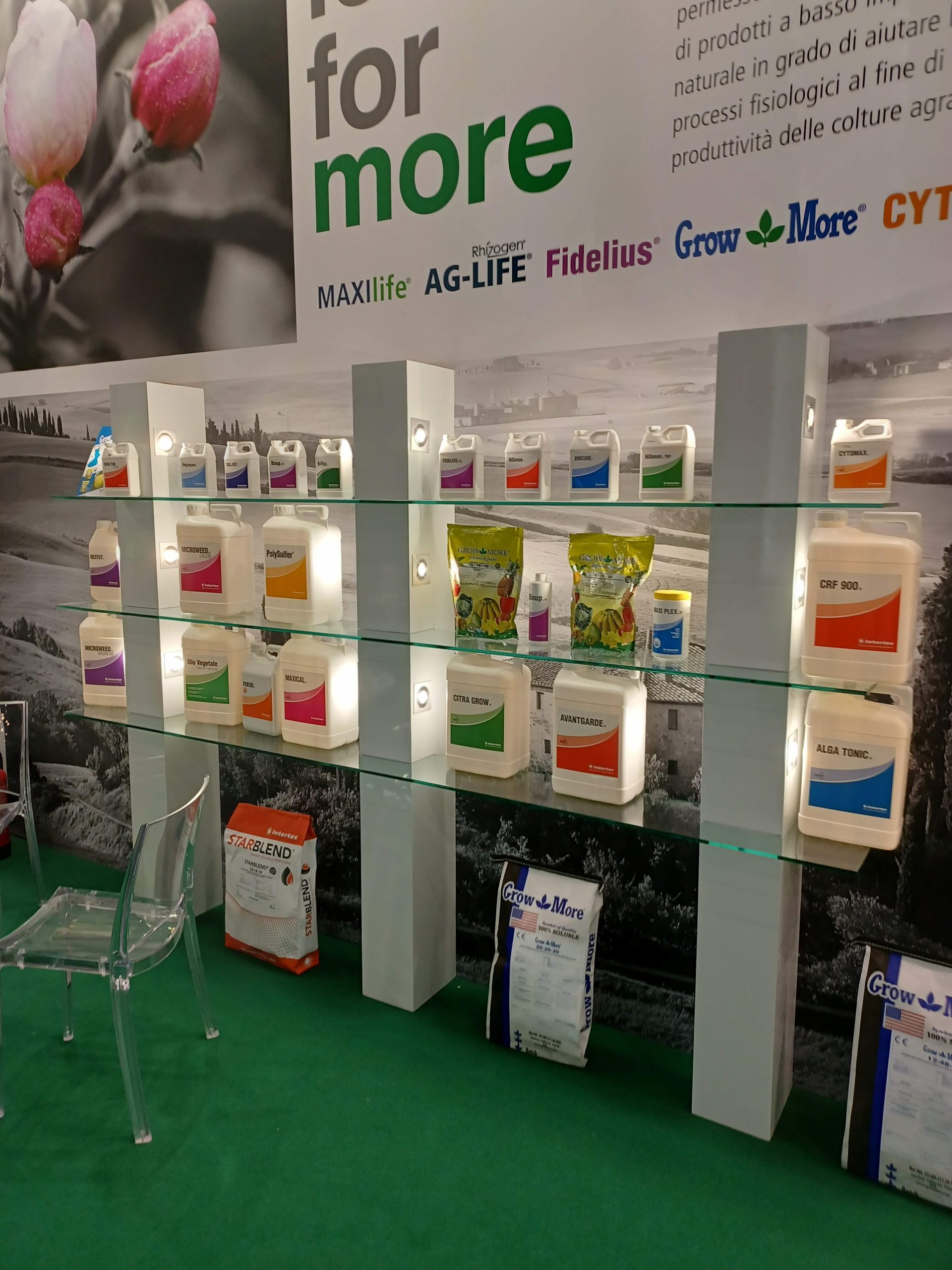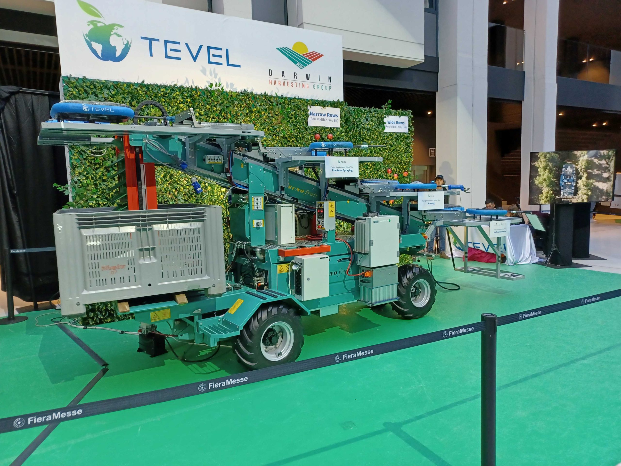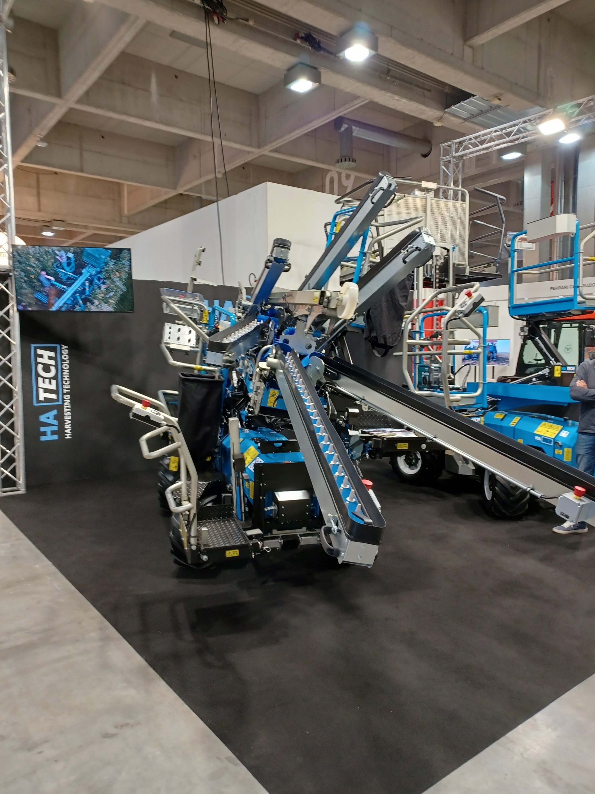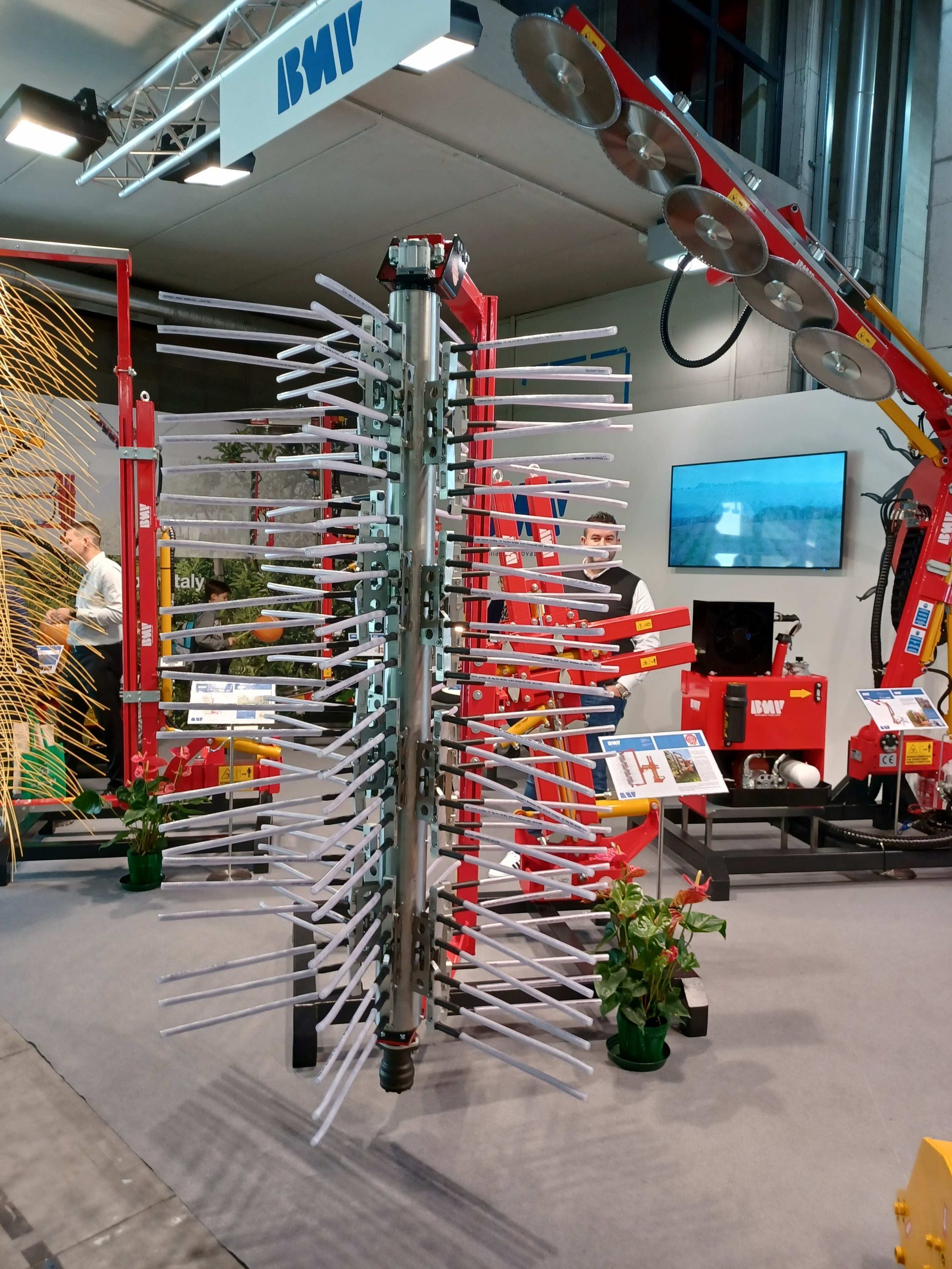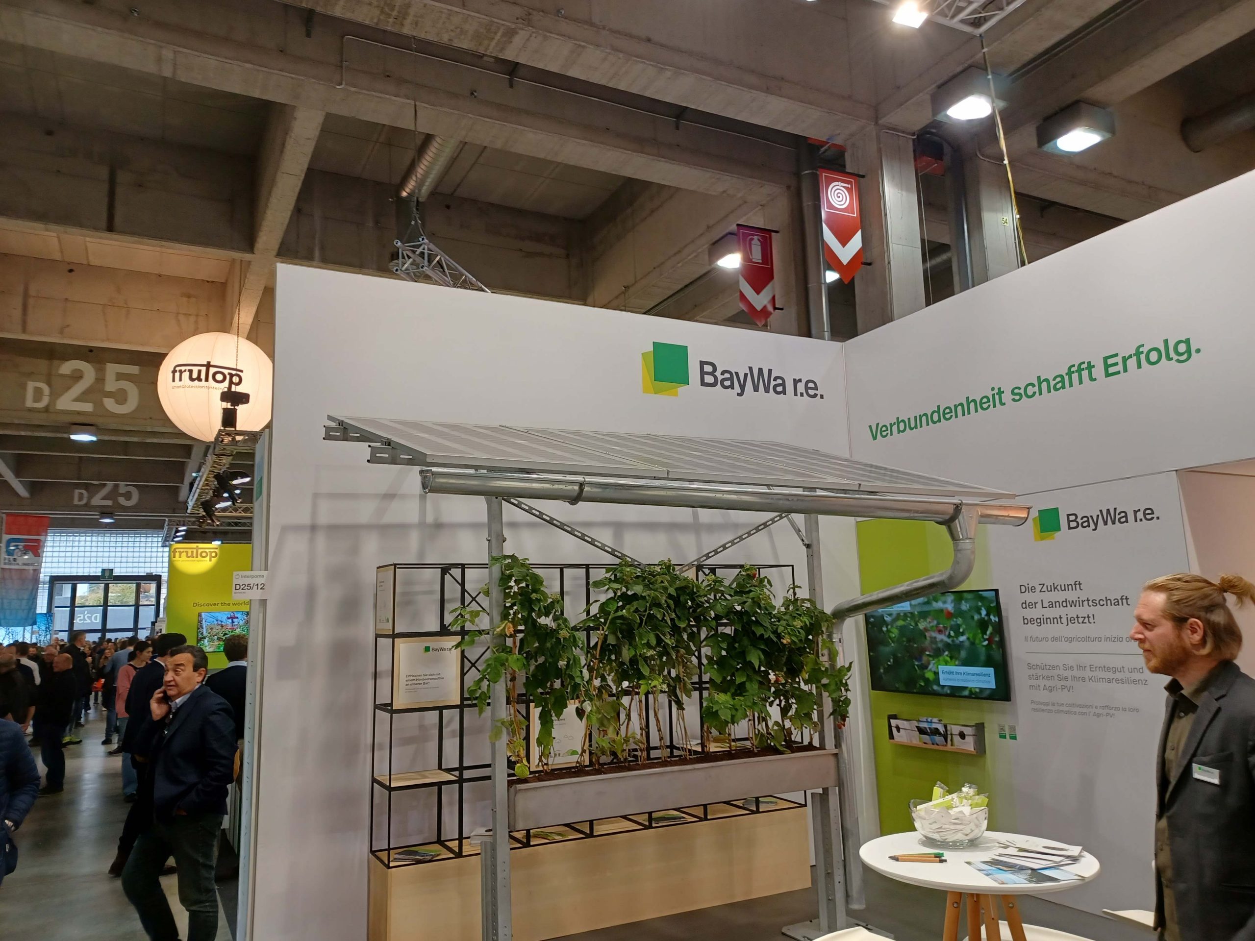 De twee belangrijkste provincies, voor wat betreft de appelteelt in Italië, Südtirol en Trentino waren zeer prominent aanwezig. Er waren ook veel boomkwekers aanwezig met nieuwe rassen en/of nieuwe selecties (Foto 1). Andere belangrijke aandachtspunten waren bladvoedingen en plantenversterkers (Foto 2) en uiteraard machines. Zo waren er o.a. elektrisch aangedreven plukwagens en plukkarren, pluk-o-tracs van verschillende merken (Foto 3), mechanische onkruidbestrijding (Foto 4), spuitmachines, sorteer- en verpakkingsmachines… Ook het bladblazen (Foto 5) en mechanisch snoeien en dunnen (Foto 6) blijft in Südtirol een actueel thema. Ook het onderzoekscentrum Laimburg (Südtirol) en de voorlichtingsdienst (Beratungsring Südtirol) hadden een stand. Verder was er op de stand van BayWa een constructie met zonnepanelen over frambozen gebouwd (Foto 7).