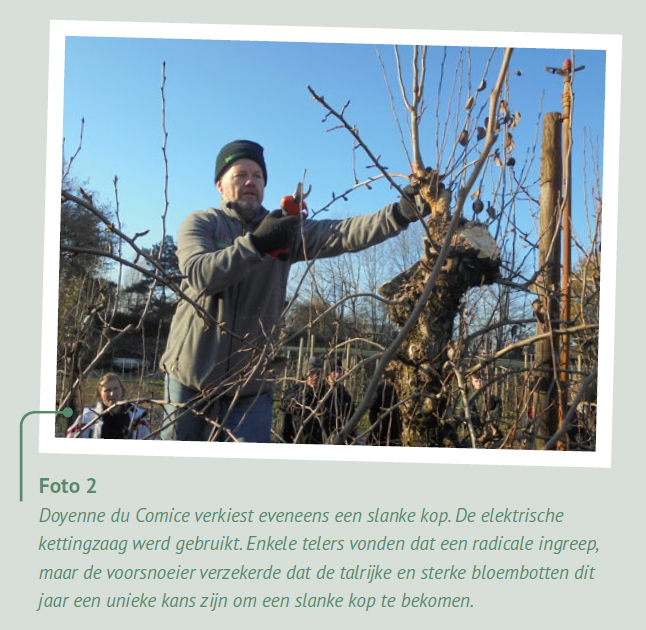 Deze belangrijke ingreep heeft vele gevolgen: de boomvorm, de voorgeschiedenis, het perceel, de belangrijke blad/vrucht verhouding, de hoeveelheid dunwerk, de zetting, de afzet en de vitaliteit van je bomen.