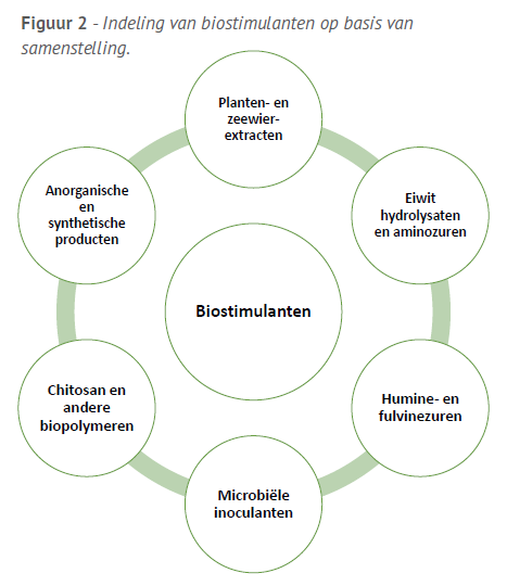 In het verleden waren er al pogingen om biostimulanten op verschillende manieren in te delen, maar een indeling op basis van werking bleek zeer moeilijk, omdat veel producten een gelijkaardige werking hebben. Het werkingsmechanisme van die producten is bovendien vaak ook nog niet volledig ontrafeld. Daarom lijkt een indeling op basis van de samenstelling het meest zinvol. We onderscheiden zes groepen (Figuur 2).