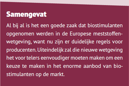 Sinds de publicatie van de nieuwe Europese meststoffenverordening is er in Europa een duidelijke definitie van biostimulanten. Die nieuwe verordening 2019/1009 is van kracht sinds 16 juli 2022. Plant-biostimulanten zijn per definitie producten die de voedingsprocessen van een plant stimuleren, onafhankelijk van het gehalte aan nutriënten van het product. Het enige doel is één of meer van de volgende eigenschappen van de plant of de rhizosfeer (wortelomgeving) van de plant te verbeteren: