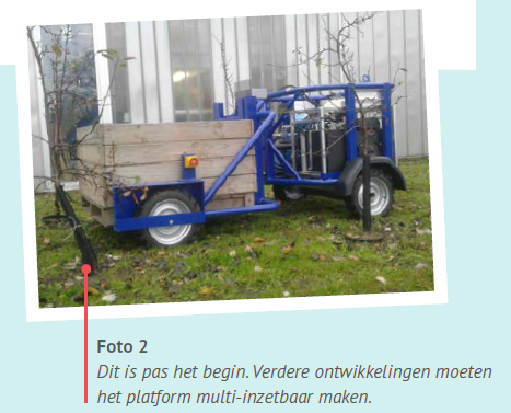 Het team achter het project heeft ambitieuze plannen om het voertuig verder te ontwikkelen en multi-inzetbaar te maken (Foto 2). Zij streven naar verbeteringen in navigatie en veiligheidsfuncties, uitbreiding van de vorkliftcapaciteit voor efficiënt transport en de toevoeging van extra functies zoals inspectie en monitoring met sensoren, maaien en mechanisch wieden. De verbrandingsmotor willen ze ombouwen, zodat ook biogas komende uit bv. slechte appels of afval, als brandstof gebruikt kan worden om de cirkel rond te maken. Het doel is om het platform het hele jaar door in te zetten. We proberen alles te realiseren in nauwe samenwerking met de sector en pcfruit.