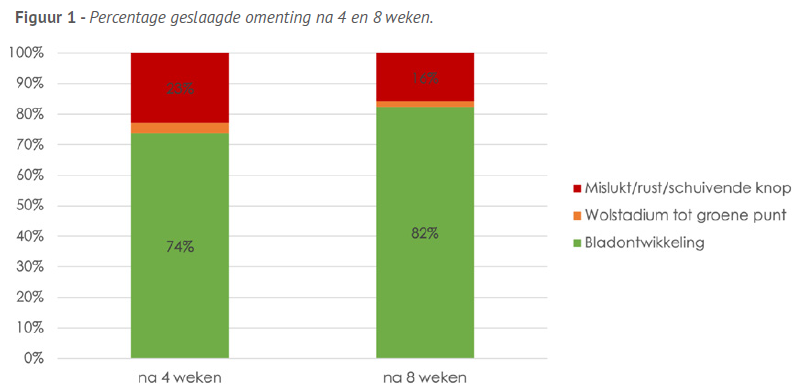 Met die informatie gingen we op pcfruit aan de slag. In totaal entten we 60 wijnstokken van Sauvignon rytos op S04 om naar Frühburgunder (GM1). Na vier weken zagen we al een slaagpercentage van 74%, mét duidelijke bladvorming (Foto 2). Na acht weken steeg dat zelfs tot 82% (Figuur 1)! Kon je er niet bij zijn tijdens de workshop? Niet getreurd! Via www.pcfruit.be kan je de presentatie van de workshop én de technische fiche terugvinden.
