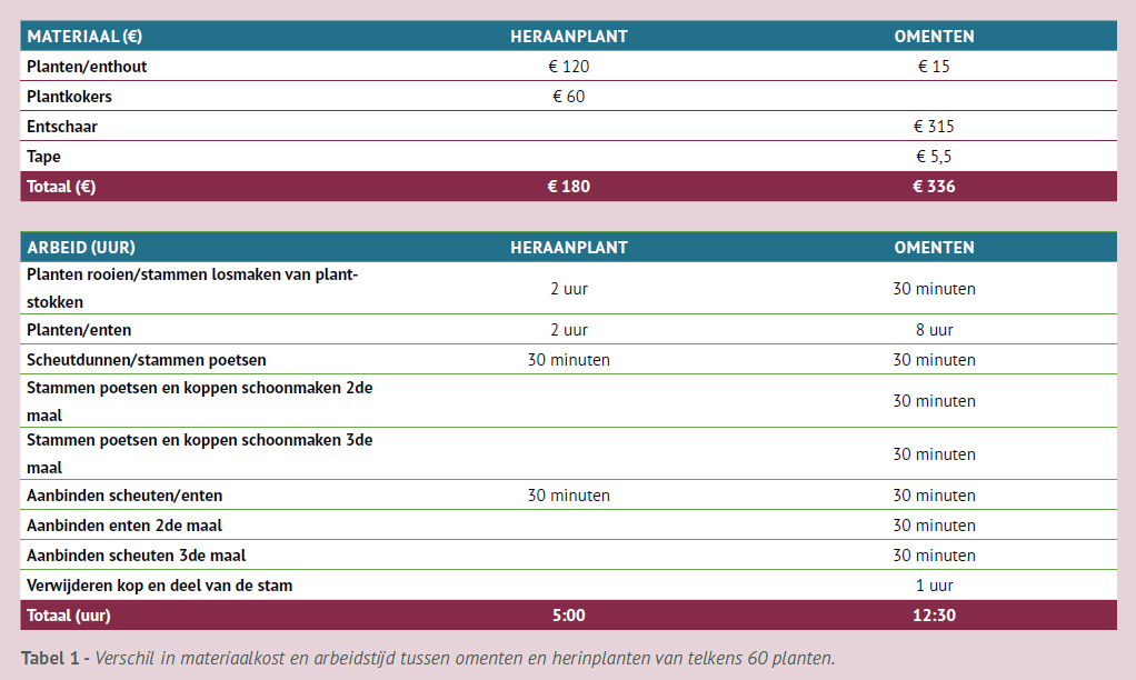 Het omenten vraagt ook heel wat meer tijd dan heraanplanten. Het verschil in arbeid zit voornamelijk in het plaatsen van de enten, wat tijdrovend is, zeker voor een onervaren enter. Je moet daarnaast de stammen en koppen veel regelmatiger poetsen voor een succesvol resultaat. Doordat je de productierank wegneemt, groeien er veel meer scheuten uit de stam en kop. Die moet je regelmatig verwijderen om de competitie met de ent te verkleinen.