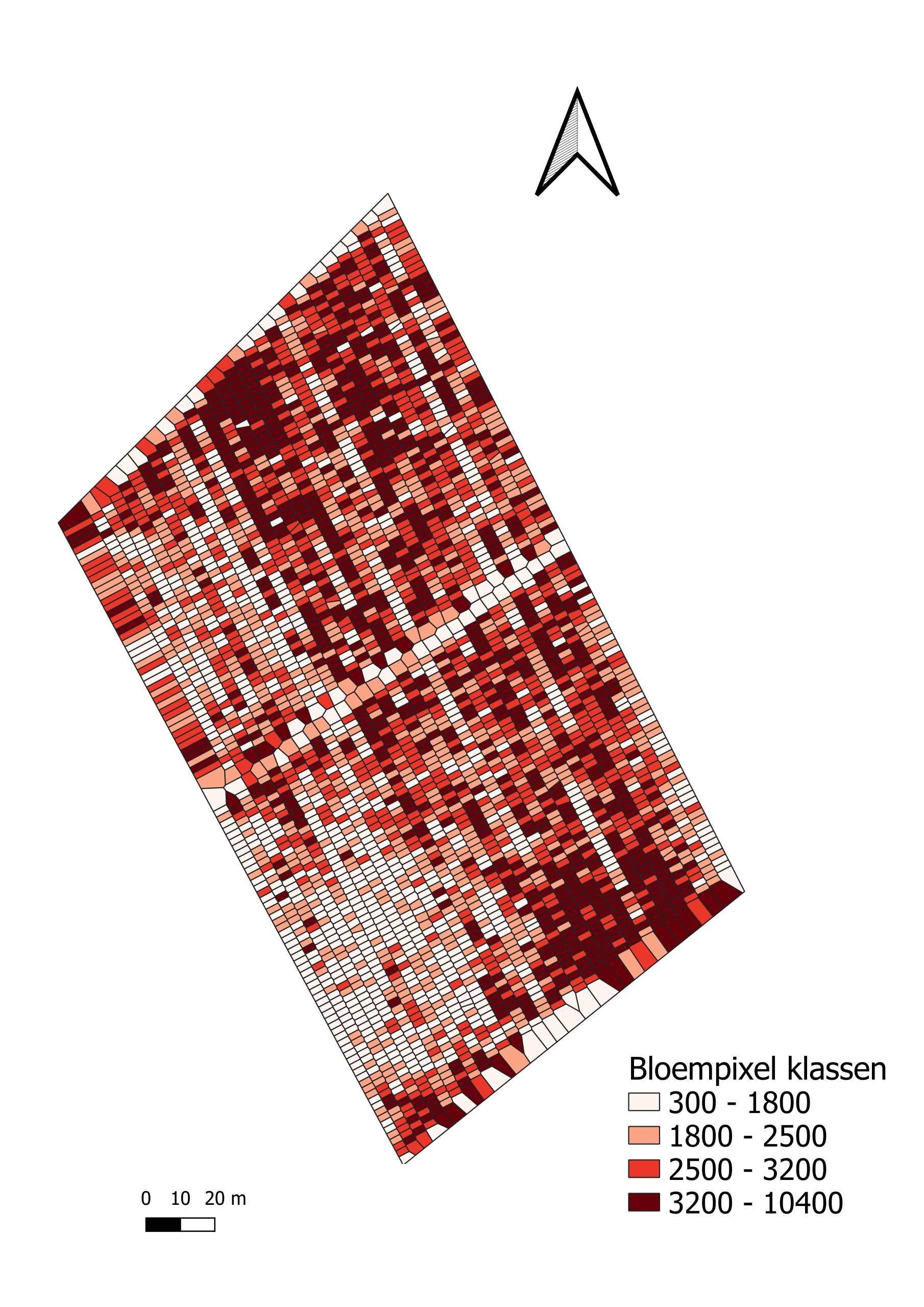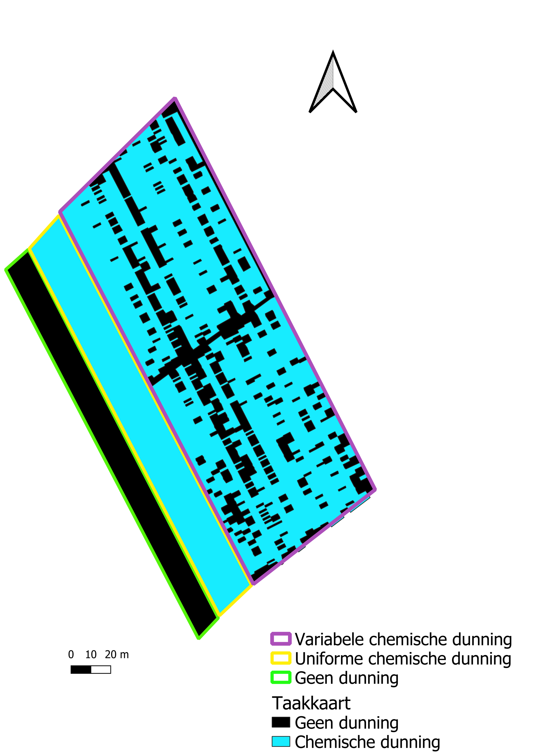 De verwerking van dronebeelden tijdens de bloei, met behulp van de Mapeo-pijplijn van VITO, toont aan dat er in een boomgaard altijd variatie is tussen bomen in het aantal bloemclusters. Die bloemclusters zijn goede voorspellers voor het aantal vruchten. Manuele tellingen bevestigen dat en worden gebruikt om van witte bloempixels in de dronebeelden (Foto 1) naar aantal bloemclusters per boom te gaan. In overleg met de teler en o.b.v. jarenlange ervaring met vruchtdunningsproeven legt pcfruit een grenswaarde van aantal bloemclusters per boom vast waaronder de boom niet gedund wordt en waarboven de boom wel met een bepaalde dosis dunningsmiddel behandeld wordt. Dat laatste gebeurt met een GPS-gestuurde spuitmachine met pulse width modulation (PWM) spuitdoppen (Foto 2). Kalibratie van de spuitmachine moet voor elke toepassing gebeuren om juist tussen twee bomen aan/uit of vice versa te kunnen schakelen. Door een digitale taakkaart te maken van de boomgaard met aanduiding van de positie van elke boom en of die wel of niet gedund moet worden (Foto 3), kan je starten met variabele dunning.