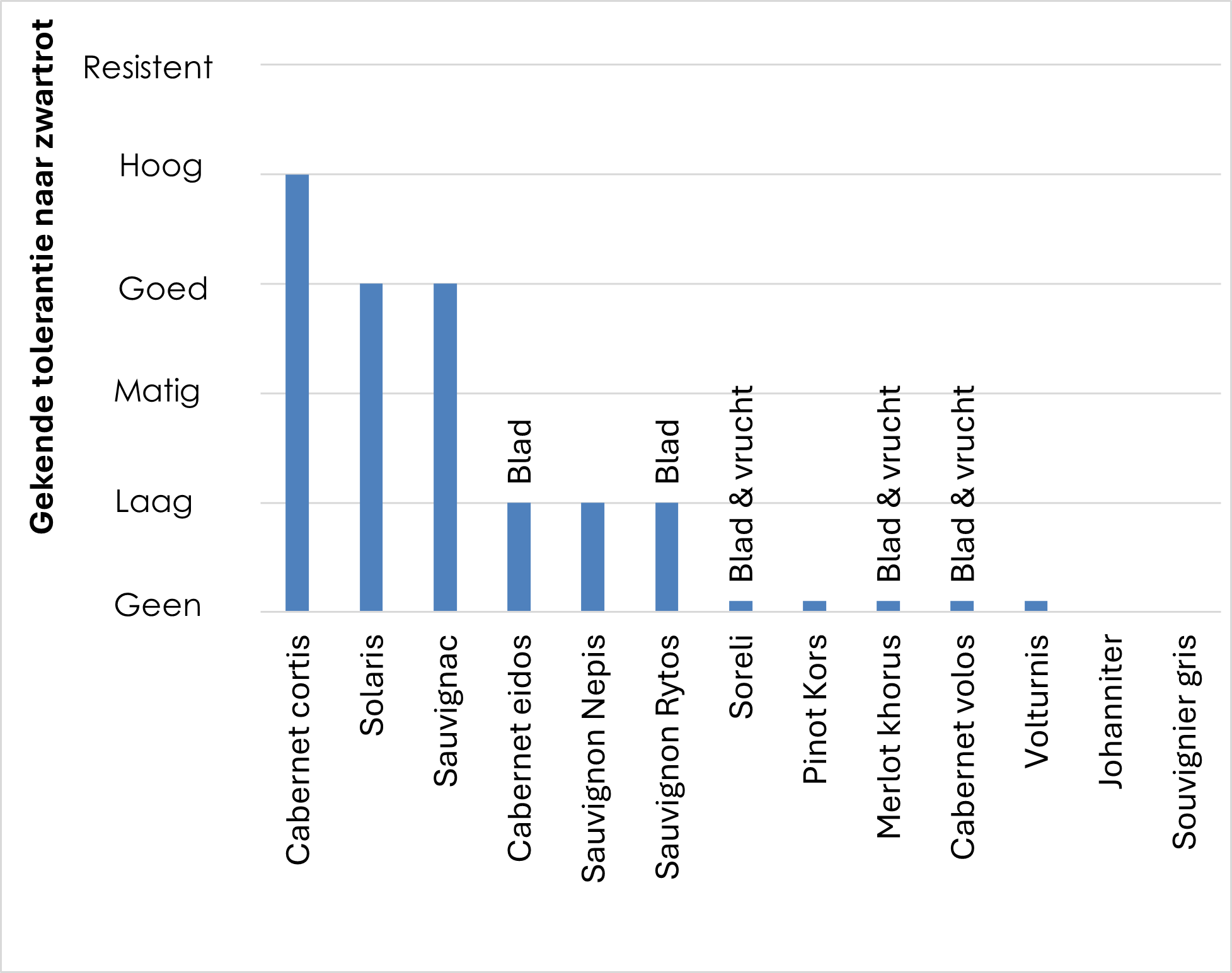 Omdat die ziekten vroeger nauwelijks in wijngaarden voorkwamen, kregen resistentiegenen naar zwartrot geen aandacht in afgelopen veredelingsschema’s. Je vindt in figuur 1 een overzicht van de aangegeven tolerantie van de verschillende variëteiten op pcfruit. Van andere variëteiten zoals Ravel blanc, Satin noir en Laurot is de tolerantie niet gekend.