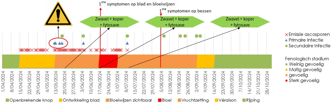 Algemeen raadt men een minimum van drie toepassingen rond de bloeiperiode aan om echte en valse meeldauw bij ziektetolerante variëteiten te behandelen. In de proefwijngaard kiezen we voor een biologisch schema met een combinatie van zwavel, koper en Fytosave en behandelen we niet extra naar zwartrot. Figuur 2 toont de toepassingen naar meeldauw en de infectiemomenten van zwartrot voor het seizoen 2024. Zo zien we dat er vóór de opstart van de gewasbescherming al primaire infecties van zwartrot kunnen voorkomen. Bij gevoelige soorten en bij sterke druk zijn extra toepassingen nodig vóór de primaire infectiemomenten.
