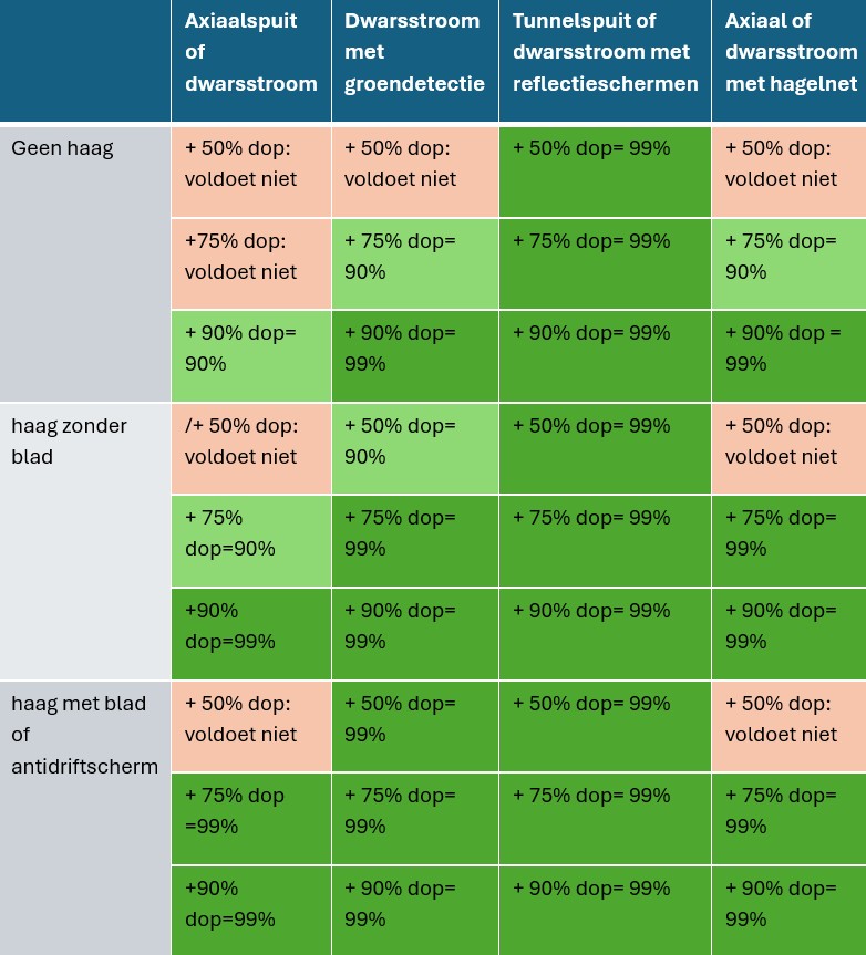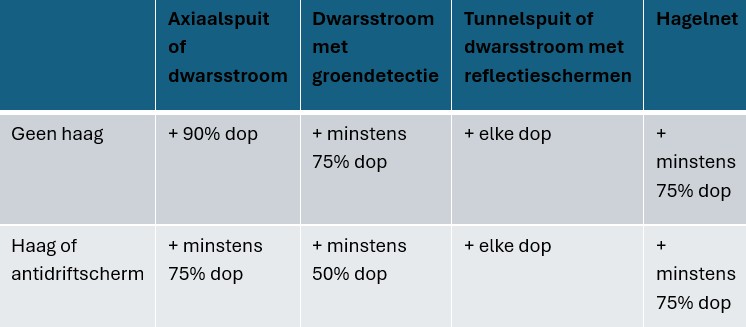 Als er gewerkt wordt met een dwarsstroomspuit met groendetectie, dan volstaan 75% driftreducerende doppen. Indien ook een haag of antidriftscherm aanwezig is, volstaan 50% driftreducerende doppen (Tabel 1).